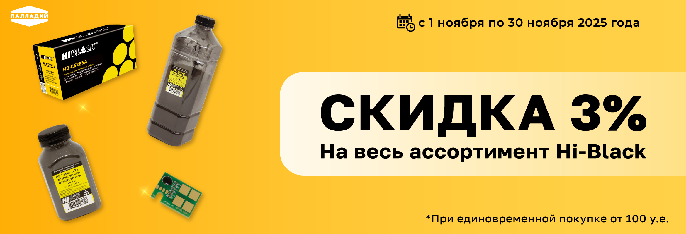 За закупку любой продукции торговых марок Hi-Black, Hi-Color, Hi-Image из постоянного ассортимента на сумму от 100 у.е. единовременно в период действия акции, вы получаете дополнительную скидку в размере 3%.